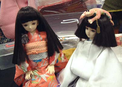 こっちは和服コンビ 左:サミュエルさんちの 白黒茶(みけ)ちゃん 右:りばさんちの 健(仮名)くん 頭に乗ってるのは、式神だそうです(笑) (うそ。本当は、サミュエルさん作の商品です) 健(仮名)くんは、りばさんのブースでこんな格好してました。 |