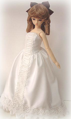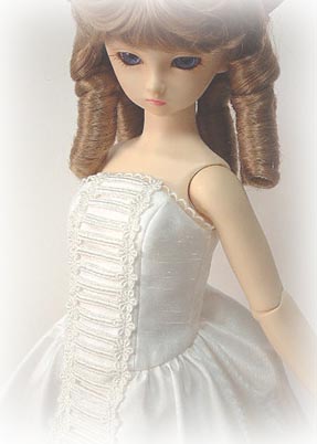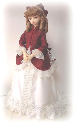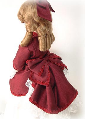| 2003年12月7日のドールズパーティー10に 展示したドレスに、修正を加えたもの。 下に着ている白のワンピースを作り直しました。 バッスルと言っても、時代によって違うんですよね。 専門学校時代の教科書を引っ張り出してしまいました。 でも、参考にしたのはネットで探した 「ドリー・バーデンスタイル」でした。(^^;) 本当はスカートやトレーンをたくし上げるみたいですが、 これは長めの上着の裾を後ろにまとめているだけなので、 正式なバッスルスタイルではありません。 |