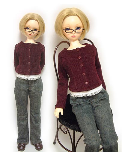 | ワインレッドのカーディガンは、もともと13少女用に作ったのですが、なぜか大きく出来てしまいました。 なにげなくSD着せたら、あらまあちょうど良いわだったので、SD用ということに。(^^;) 画像には映っていませんが、カーディガンの胸元から、下のキャミソールがちらっと見えるのです・・・ |
