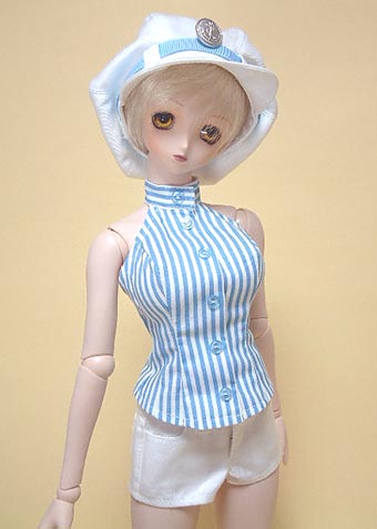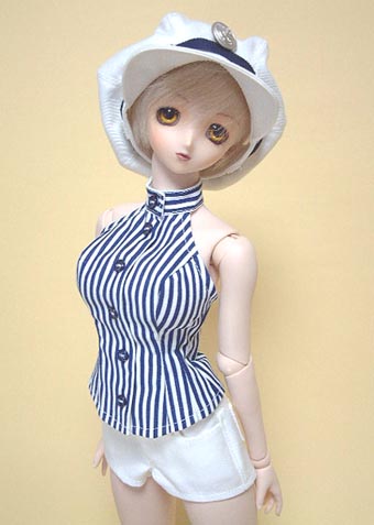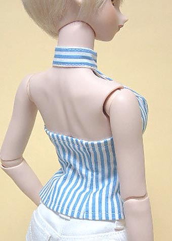 スカイブルーとネイビーブルーのストライプホルターネックと